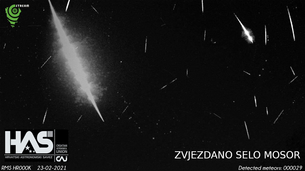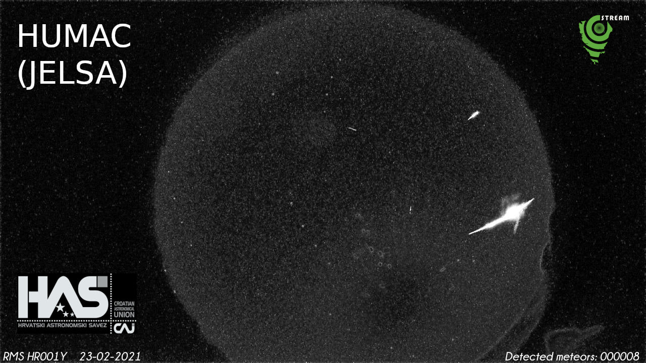 Po lokalnom vremenu u točno 23. sekundi utorka, 23. veljače ove godine kamere Hrvatske meteorske mreže snimile su let a i pad vrlo sjajnog meteora, pinkicu slabijeg sjaja od Mjeseca u fazi prve četvrti. Više kamera ove mreže zabilježilo je rijetki događaj dok su snimke četiri kamere, one u blizini Zadra, s otoka Čiova, iz Zvjezdanog sela Mosor i iz etno sela Humac poviše Jelse na otoku Hvaru, omogućile izračun putanje i ostale analize. Koodinator meteorske mreže Damir Šegon tako izvještava da je tijelo usporedive veličine s rukometnom loptom u atmosferu Zemlje ušlo, u ovozemaljskim razmjerima vrtoglavom brzinom od oko 19,7 kilometara u sekundi (70920 km/h), svoj sjajni put započelo na visini od oko 84 kilometra, da se nakon nešto više od četiri sekunde preleta gasi pri brzini nešto manjoj od 3 kilometra u sekundi (10800 km/h) na visini od 26 kilometara. Analiza dinamike u zadnjoj točki svijetlog leta ukazuje na to da je meteorid, točnije njegov manji dio preživio svijetli let, kad izgaranjem u zemljinoj atmosferi gubi masu te se u toj kratkoj čaroliji uspio svesti na svega 25 grama mase i 25 milimetara promjera, veličine slične stolnoteniskoj ili golf loptici. U procjenama je korištena tipična gustoća od 3300 kilograma po metru kubičnom a krivulja leta i orbita tijela ukazuje nam na njegovo porijeklo iz asteroidnog pojasa.